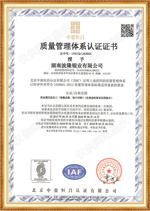 湖南波隆銀業(yè)有限公司是湖南波隆集團(tuán)股份有限公司的全資子公司,成立于2016年4月15日,注冊資金1000萬。集白銀類產(chǎn)品的研發(fā)、銷售于一體,年營收1.22億元。2017年6月底,湖南波隆銀業(yè)有限公司順利通過了ISO9001質(zhì)量體系管理認(rèn)證,并獲得了相關(guān)文件證書,這標(biāo)志著波隆銀業(yè)逐步邁入規(guī)范化、標(biāo)準(zhǔn)化的現(xiàn)代企業(yè)管理軌道。