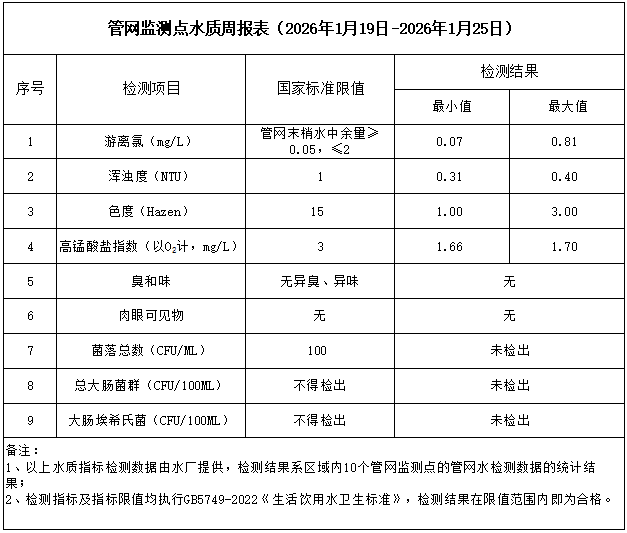 管網(wǎng)監(jiān)測點(diǎn)水質(zhì)周報(bào)表(2026年1月19日-2026年1月25日)