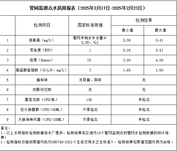 管網(wǎng)監(jiān)測(cè)點(diǎn)水質(zhì)周報(bào)表(2025年2月17日-2025年2月23日)