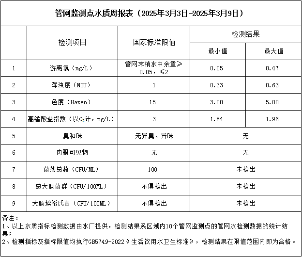 管網(wǎng)監(jiān)測(cè)點(diǎn)水質(zhì)周報(bào)表(2025年3月3日-2025年3月9日)