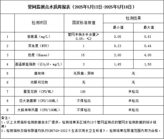 管網(wǎng)監(jiān)測點水質(zhì)周報表(2025年5月12日-2025年5月18日)