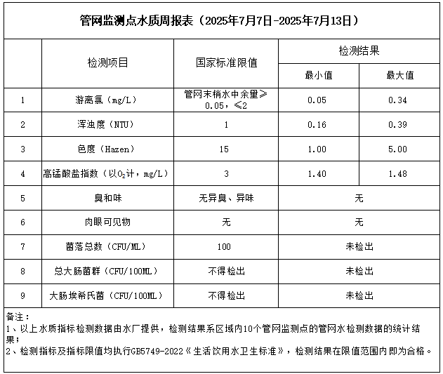 管網(wǎng)監(jiān)測點(diǎn)水質(zhì)周報(bào)表(2025年7月7日-2025年7月13日)