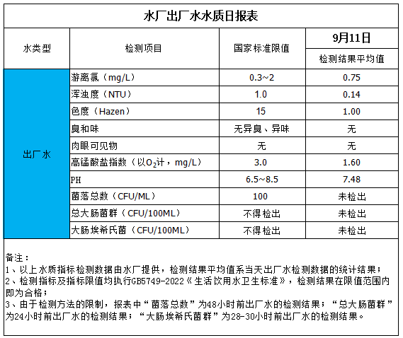 水廠出廠水水質(zhì)日?qǐng)?bào)表(2025-9-11)