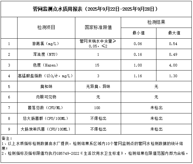 管網(wǎng)監(jiān)測(cè)點(diǎn)水質(zhì)周報(bào)表(2025年9月22日-2025年9月28日)