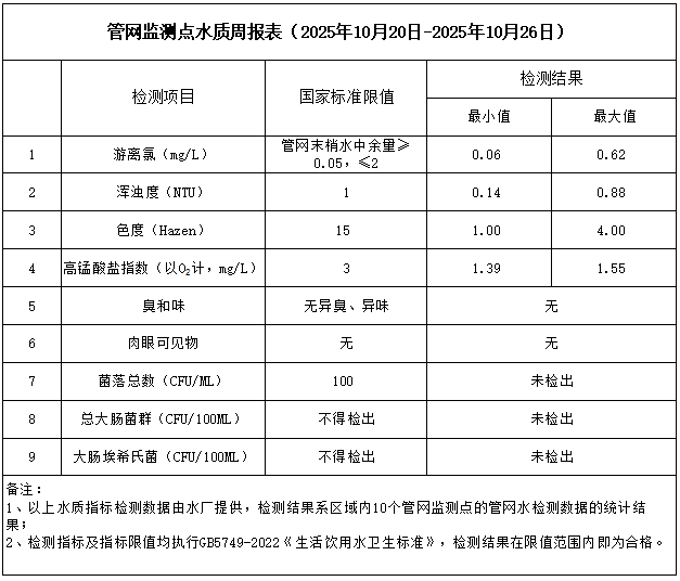 管網(wǎng)監(jiān)測點水質(zhì)周報表(2025年10月20日-2025年10月26日)