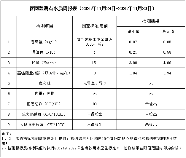 管網(wǎng)監(jiān)測點水質(zhì)周報表(2025年11月24日-2025年11月30日)