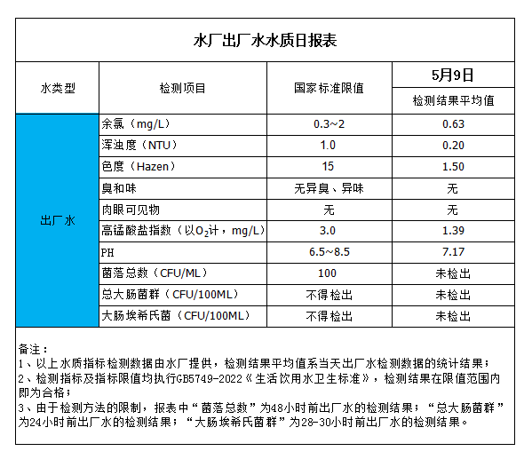 水廠出廠水水質(zhì)日?qǐng)?bào)表(2023-5-9)