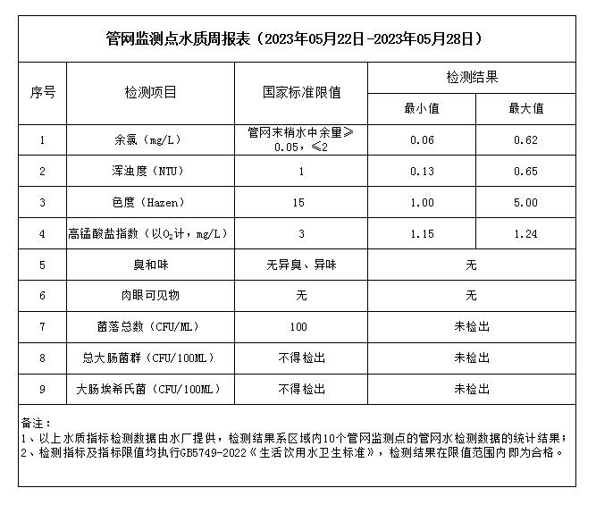 管網(wǎng)監(jiān)測點水質周報表(2023年05月22日-2023年05月28日)