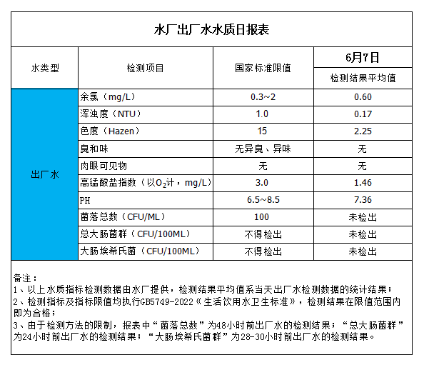 水廠出廠水水質(zhì)日?qǐng)?bào)表(2023-6-7)
