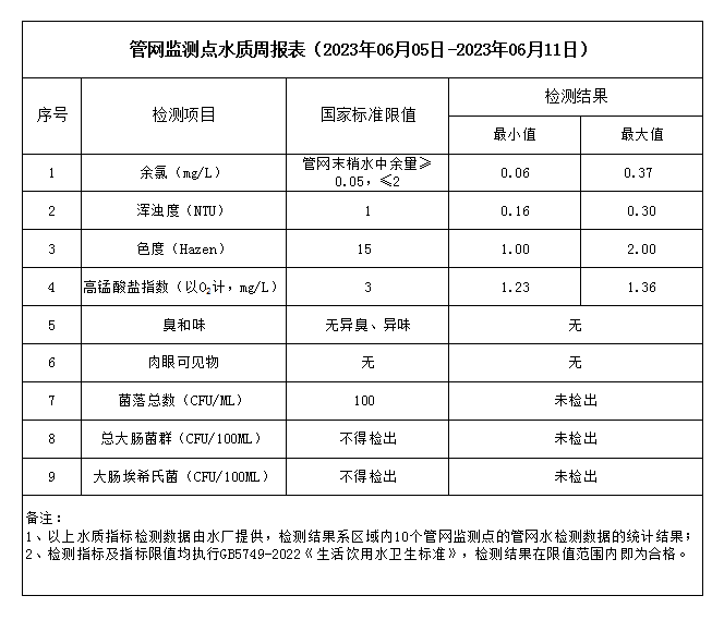 管網(wǎng)監(jiān)測(cè)點(diǎn)水質(zhì)周報(bào)表(2023年06月05日-2023年06月11日)