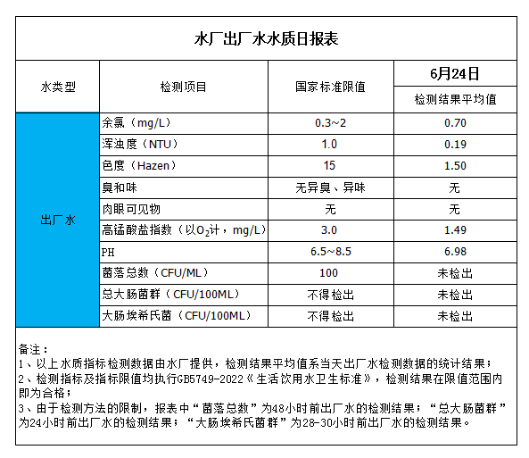 水廠出廠水水質(zhì)日報表(2023-6-24)