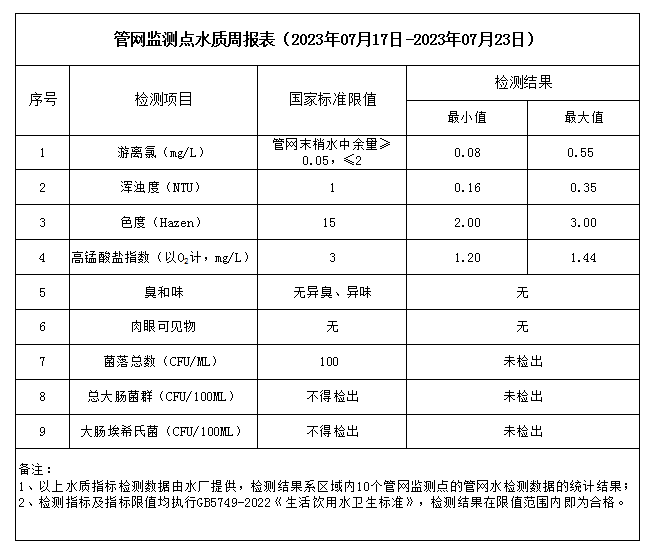 管網(wǎng)監(jiān)測點(diǎn)水質(zhì)周報(bào)表(2023年07月17日-2023年07月23日)