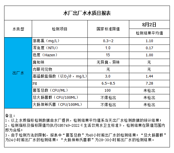 水廠出廠水水質(zhì)日?qǐng)?bào)表(2023-8-2)