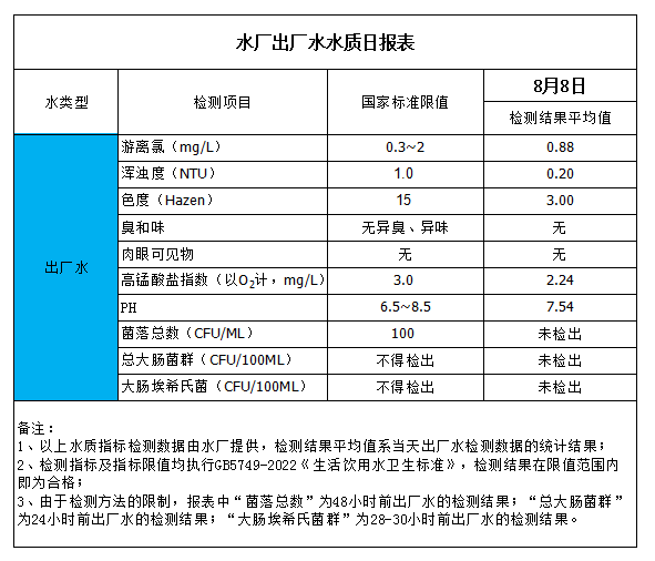水廠出廠水水質(zhì)日報表(2023-8-8)