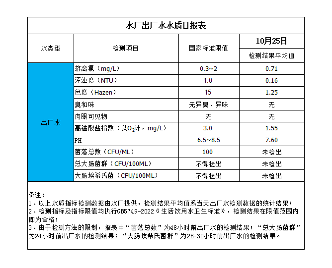 水廠出廠水水質(zhì)日報(bào)表(2023-10-25)