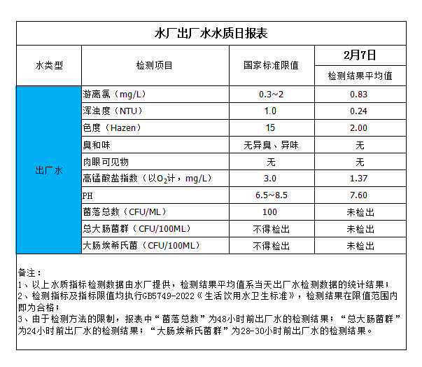 水廠出廠水水質(zhì)日報表(2024-2-7)