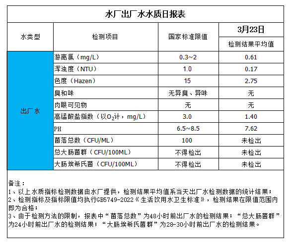 水廠出廠水水質(zhì)日?qǐng)?bào)表(2024-3-23)