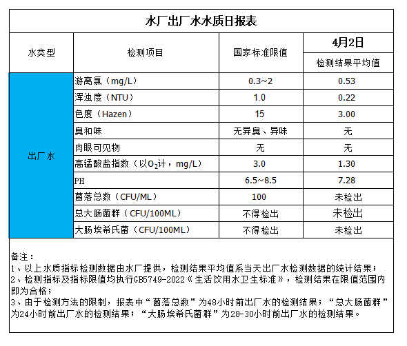 水廠出廠水水質(zhì)日?qǐng)?bào)表(2024-4-2)