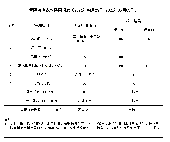 管網(wǎng)監(jiān)測點水質周報表(2024年04月29日-2024年05月05日)