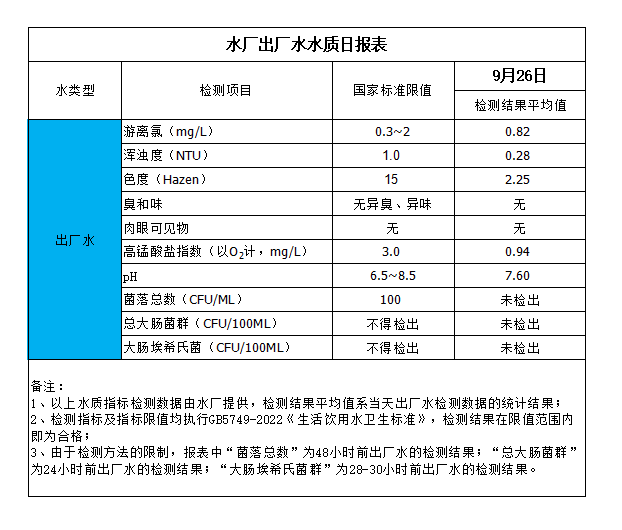水廠出廠水水質(zhì)日報表(2024-9-26)
