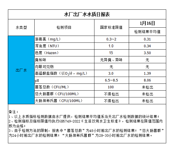 水廠出廠水水質(zhì)日?qǐng)?bào)表(2025-1-16)